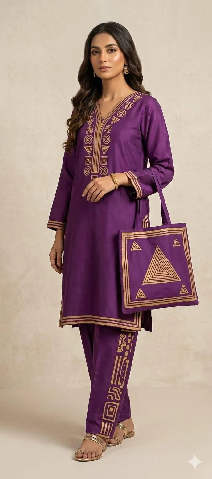 Purple Linen Printed 3Pc Set with Bag